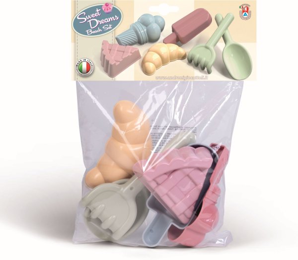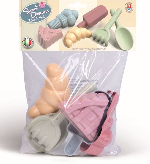6dílná sada tvořítek na písek - cukrárna. Vyrobeno v Itálii z kvalitních plastů. Obsahuje: Hrabičky, lopatku a tvořítka: nanuk, zmrzlina, dortík a croissant. Baleno v sáčku o rozměrech 23 x 31 cm. Váha: 0,17 kg. Doporučený věk od 10 měsíců.