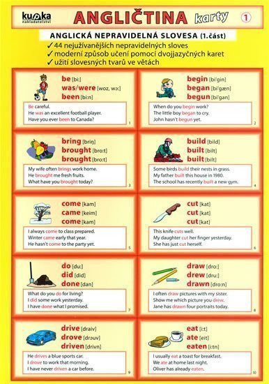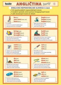 Karty k procvičování nepravidelných sloves včetně jejich užití ve větách. Obsahuje 44 nejužívanějších nepravidelných sloves, záložku se všemi tvary sloves a gramatickou záložku slovesných časů.