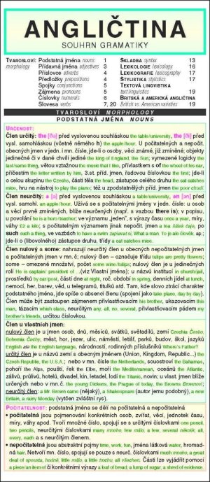 Koncentrovaný přehled (tvarosloví, skladba, lexikologie, lexikografie, stylistika, textová lingvistika, britská a americká angličtina) sumarizuje učební látku. Přehledné členění, grafická úprava a volba barev umožňuje rychlou orientaci v textu a snadnější zapamatování.