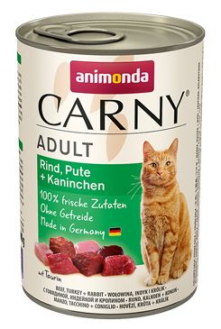 Konzerva s hovězím, krůtím a králičím masem. Kompletní krmivo pro dospělé kočky.
