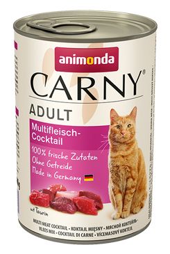 Konzerva s masovou směsí. Kompletní krmivo pro dospělé kočky.