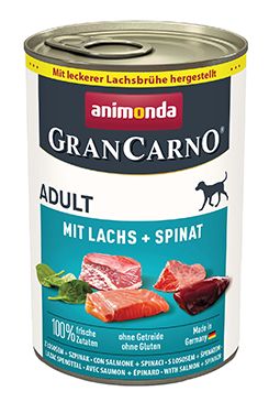 Animonda GranCarno Adultoptimálně vyvážené a chutné krmivo pro dospělého psa ve věku 1–6 letvyrobeno z čerstvého masa a vnitřností - s viditelnými masovými kouskyvynikající masová chuť - nefalšovaný požitekbez obilovin, bez lepku, bez sóji, bez cukrubez umělých barviv a konzervačních látekSložení: 52 % vepřového masa (srdce, játra, plíce, maso), 29 % vývar z lososa, 12 % losos, 4 % špenát, minerální látky, světlicový olejAnalytické složky: protein 10,5 %, obsah tuku 5 %, vláknina 0,4 %, popel 2,5 %, vlhkost 79 %Nutriční doplňkové látky (kg): 200 IU vitaminu D3, 1,4 mg monohydrát síranu manganatého, 25 mg síranu zinečnatého, monohydrátu, 0,5 mg síranu měďnatého(II) pentahydrátuHmotnost: 400 g