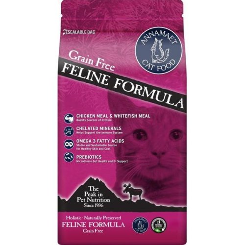 Annamaet Grain Free Feline je receptura vyráběná zcela bez použití obilovin, věrná masožravému původu koček. Vyrábí se z bílých mořských ryb z volného oceánu a kuřat chovaných bez použití antibiotik a hormonů. Díky tomu obsahuje velké množství kvalitních bílkovin a tuků. Krmivo je určené pro kočky ve všech životních stádiích.