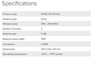 Technické specifikace: Product code: MTAO-LTE-5D-SQ Antenna type: Omni Wireless band: 699 - 2690 MHz Number of chains: 2 Antenna gain 5 dBi Antenna beam width: 360° Connectors: 2x SMA female Dimensions: 129 x 129 x 34 mm Operating temperature: -40°C .. +70°C tested