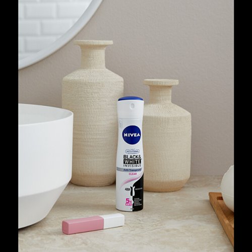 Antiperspirant ve spreji Invisible For Black & White Clear s atraktivní lehkou vůní poskytuje spolehlivou ochranu proti pocení bez bílých stop a žlutých skvrn na oblečení.
