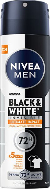 Antiperspirant ve spreji Men Invisible Black & White Ultimate Impact vás ochrání před potem a pachem až na 72 hodin. Zajistí vám dlouhotrvající účinnost proti zápachu, potu, skvrnám, podráždění a pozůstatkům antiperspirantu. Chrání pokožku a oblečení před potem, bílými stopami a žlutými skvrnami.