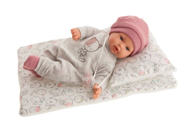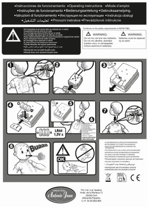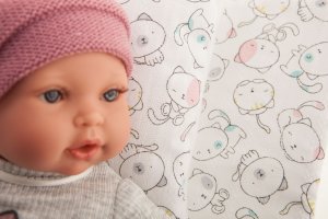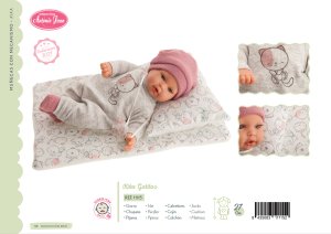 Plačící, ručně vyrobená realistická španělská panenka, reagující na magnetický dudlík. Po vytažení dudlíku z úst vydává reálný zvuk plačícího dítěte, který lze utišit opět dudlíkem. Panenka má měkké látkové tělo, hlava a končetiny jsou vyrobené z kvalitního měkčeného vinylu. Oblečení některých panenek bylo vyrobeno z organické bavlny, která zaručuje výrobu z ručně sbírané, ekologicky bez chemického ošetření pěstované bavlny. Firma Antonio Juan klade velký důraz na ekologii a proto jako první využívá v tomto odvětví zmíněnou bavlnu. Velikost 27 cm. Baleno v dárkové krabici. Doporučený věk od 3 let. Součástí balení je 3 x knoflíková baterie LR44 s návodem na její výměnu. Baterie jsou spotřební zboží a proto jejich vybití není důvodem k reklamaci panenky.
