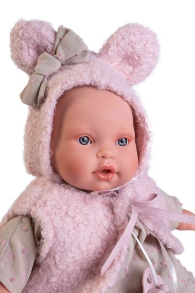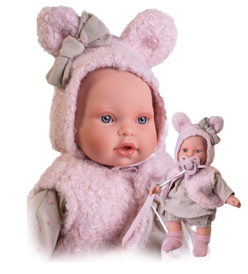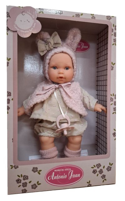 Plačící a mluvící, ručně vyrobená realistická španělská panenka, reagující na magnetický dudlík. Po vytažení dudlíku z úst vydává reálný zvuk plačícího dítěte, který lze utišit opět dudlíkem a říká „mama“, „papa“. Panenka má měkké látkové tělo, hlava a končetiny jsou vyrobené z kvalitního měkčeného vinylu. Oblečení některých panenek bylo vyrobeno z organické bavlny, která zaručuje výrobu z ručně sbírané, ekologicky bez chemického ošetření pěstované bavlny. Firma Antonio Juan klade velký důraz na ekologii a proto jako první využívá v tomto odvětví zmíněnou bavlnu. Velikost 27 cm. Baleno v dárkové krabici. Doporučený věk od 2 let. Součástí balení je 3 x knoflíková baterie LR44 s návodem na její výměnu. Baterie jsou spotřební zboží a proto jejich vybití není důvodem k reklamaci panenky.