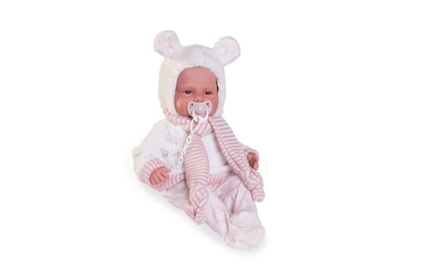 Mluvící, ručně vyrobená realistická španělská panenka - miminko. Po zatlačení na bříško začne panenka vydávat zvuky podobné dětskému žvatlání. Panenka má měkké látkové tělo, hlava a končetiny jsou vyrobené z kvalitního měkčeného vinylu. Oblečení některých panenek bylo vyrobeno z organické bavlny, která zaručuje výrobu z ručně sbírané, ekologicky bez chemického ošetření pěstované bavlny. Firma Antonio Juan klade velký důraz na ekologii a proto jako první využívá v tomto odvětví zmíněnou bavlnu. Velikost 50 cm. Baleno v dárkové krabici. Doporučený věk od 3 let. Součástí balení je 3 x knoflíková baterie LR44 s návodem na její výměnu. Baterie jsou spotřební zboží a proto jejich vybití není důvodem k reklamaci panenky.