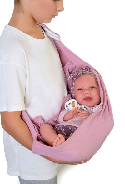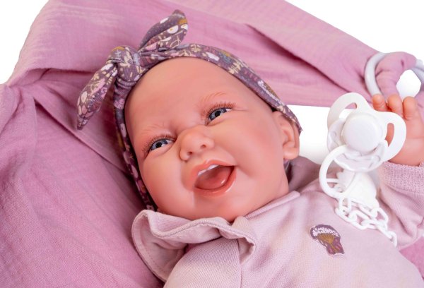 Ručně vyrobená realistická španělská panenka - miminko s realistickými prvky v obličeji a na končetinách. Ruce a nohy jsou k tělu přichycené kloubem s možností polohování, což miminku umožňuje třeba i samostatné sezení bez opory. Panenka má měkké látkové tělo, hlava a končetiny jsou vyrobené ze speciálního měkčeného vinylu, příjemného na dotek. Oblečení některých panenek bylo vyrobeno z organické bavlny, která zaručuje výrobu z ručně sbírané, ekologicky bez chemického ošetření pěstované bavlny. Firma Antonio Juan klade velký důraz na ekologii a proto jako první využívá v tomto odvětví zmíněnou bavlnu. Velikost 42 cm. Baleno v dárkové krabici. Doporučený věk od 3 let.