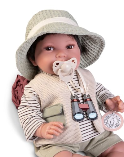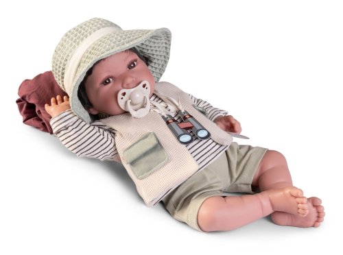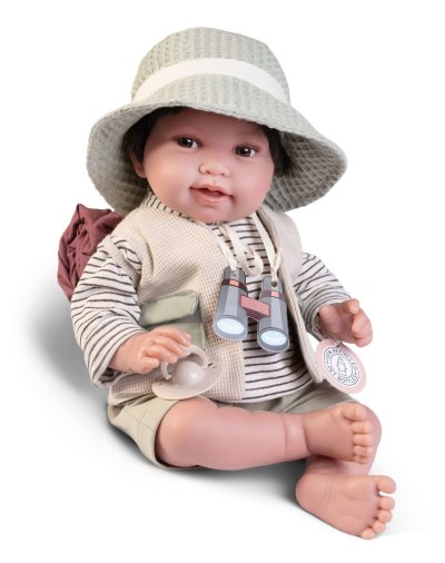 Ručně vyrobená realistická španělská panenka - miminko s realistickými prvky v obličeji a na končetinách. Ruce a nohy jsou k tělu přichycené kloubem s možností polohování, což miminku umožňuje třeba i samostatné sezení bez opory. Panenka má měkké látkové tělo, hlava a končetiny jsou vyrobené ze speciálního měkčeného vinylu, příjemného na dotek. Oblečení některých panenek bylo vyrobeno z organické bavlny, která zaručuje výrobu z ručně sbírané, ekologicky bez chemického ošetření pěstované bavlny. Firma Antonio Juan klade velký důraz na ekologii a proto jako první využívá v tomto odvětví zmíněnou bavlnu. Velikost 42 cm. Baleno v dárkové krabici. Doporučený věk od 3 let.