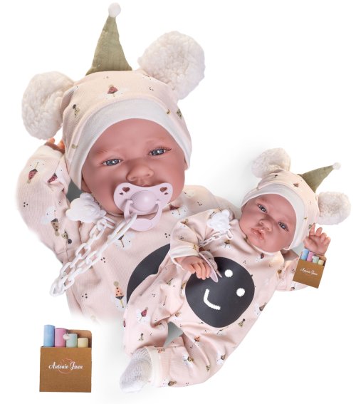 Ručně vyrobená realistická španělská panenka - miminko s realistickými prvky v obličeji a na končetinách. Ruce a nohy jsou k tělu přichycené kloubem s možností polohování, což miminku umožňuje třeba i samostatné sezení bez opory. Panenka má měkké látkové tělo, hlava a končetiny jsou vyrobené ze speciálního měkčeného vinylu, příjemného na dotek. Oblečení některých panenek bylo vyrobeno z organické bavlny, která zaručuje výrobu z ručně sbírané, ekologicky bez chemického ošetření pěstované bavlny. Firma Antonio Juan klade velký důraz na ekologii a proto jako první využívá v tomto odvětví zmíněnou bavlnu. Velikost 42 cm. Baleno v dárkové krabici. Doporučený věk od 3 let.