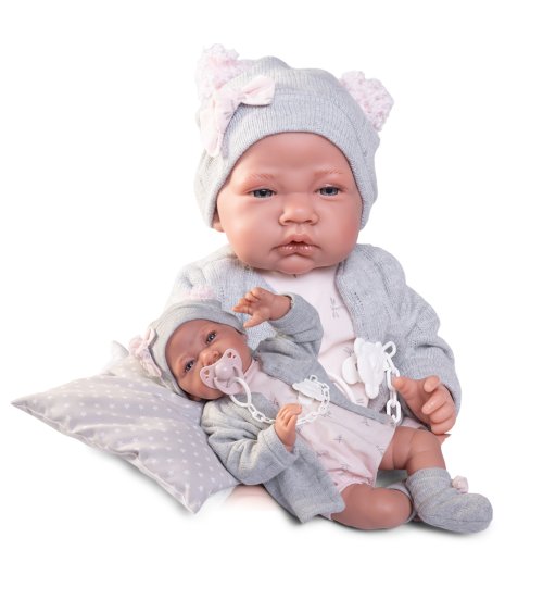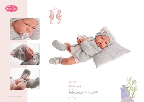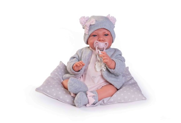 Ručně vyrobená realistická španělská panenka - miminko s realistickými prvky v obličeji a na končetinách. Ruce a nohy jsou k tělu přichycené kloubem s možností polohování, což miminku umožňuje třeba i samostatné sezení bez opory. Panenka má měkké látkové tělo, hlava a končetiny jsou vyrobené ze speciálního měkčeného vinylu, příjemného na dotek. Oblečení některých panenek bylo vyrobeno z organické bavlny, která zaručuje výrobu z ručně sbírané, ekologicky bez chemického ošetření pěstované bavlny. Firma Antonio Juan klade velký důraz na ekologii a proto jako první využívá v tomto odvětví zmíněnou bavlnu. Velikost 42 cm. Baleno v dárkové krabici. Doporučený věk od 3 let.