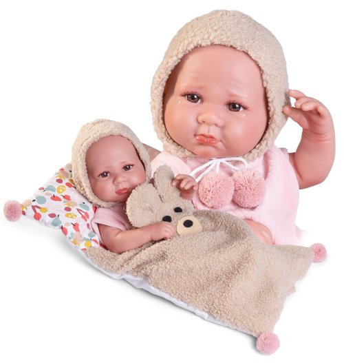 Ručně vyrobená realistická španělská panenka - miminko new born s celovinylovým tělem a realistickým vyobrazením různých miminkovských faldíků a detailů včetně pohlaví. Panenka je vyrobená ze speciálního měkčeného vinylu, velmi příjemného na dotek. Miminko lze koupat, ale je potřeba dát pozor, aby se nenamočily řasy. Odlepené řasy nejsou pak důvodem k reklamaci. Oblečení některých panenek bylo vyrobeno z organické bavlny, která zaručuje výrobu z ručně sbírané, ekologicky bez chemického ošetření pěstované bavlny. Firma Antonio Juan klade velký důraz na ekologii a proto jako první využívá v tomto odvětví zmíněnou bavlnu. Velikost 42 cm. Baleno v dárkové krabici. Doporučený věk od 3 let.