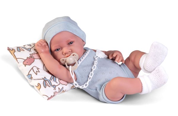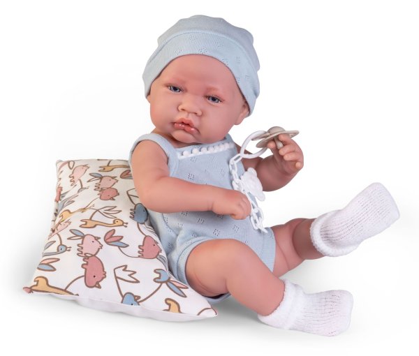 Ručně vyrobená realistická španělská panenka - miminko new born s celovinylovým tělem a realistickým vyobrazením různých miminkovských faldíků a detailů včetně pohlaví. Panenka je vyrobená ze speciálního měkčeného vinylu, velmi příjemného na dotek. Miminko lze koupat, ale je potřeba dát pozor, aby se nenamočily řasy. Odlepené řasy nejsou pak důvodem k reklamaci. Oblečení některých panenek bylo vyrobeno z organické bavlny, která zaručuje výrobu z ručně sbírané, ekologicky bez chemického ošetření pěstované bavlny. Firma Antonio Juan klade velký důraz na ekologii a proto jako první využívá v tomto odvětví zmíněnou bavlnu. Velikost 42 cm. Baleno v dárkové krabici. Doporučený věk od 3 let.