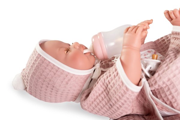 Mrkací a čůrající, ručně vyrobená realistická španělská panenka - miminko new born s celovinylovým tělem a realistickým vyobrazením různých miminkovských faldíků a detailů včetně pohlaví. Panenka je vyrobená ze speciálního měkčeného vinylu, velmi příjemného na dotek. Oblečení některých panenek bylo vyrobeno z organické bavlny, která zaručuje výrobu z ručně sbírané, ekologicky bez chemického ošetření pěstované bavlny. Firma Antonio Juan klade velký důraz na ekologii a proto jako první využívá v tomto odvětví zmíněnou bavlnu. Velikost 42 cm. Součástí balení je i lahvička plnitelná vodou, dvě jednorázové plínky a vanička. Baleno v dárkové krabici. Doporučený věk od 3 let.