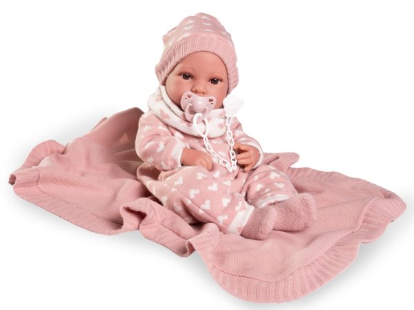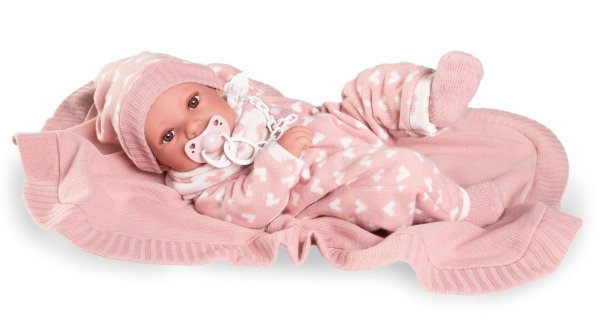 Ručně vyrobená realistická španělská panenka - miminko new born s celovinylovým tělem a realistickým vyobrazením různých miminkovských faldíků a detailů včetně pohlaví. Panenka je vyrobená ze speciálního měkčeného vinylu, velmi příjemného na dotek. Miminko lze koupat, ale je potřeba dát pozor, aby se nenamočily řasy. Odlepené řasy nejsou pak důvodem k reklamaci. Oblečení některých panenek bylo vyrobeno z organické bavlny, která zaručuje výrobu z ručně sbírané, ekologicky bez chemického ošetření pěstované bavlny. Firma Antonio Juan klade velký důraz na ekologii a proto jako první využívá v tomto odvětví zmíněnou bavlnu. Velikost 42 cm. Baleno v dárkové krabici. Doporučený věk od 3 let.