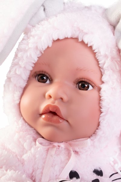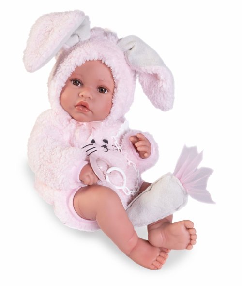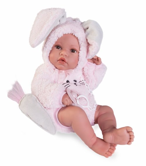 Ručně vyrobená realistická španělská panenka - miminko new born s celovinylovým tělem a realistickým vyobrazením různých miminkovských faldíků a detailů včetně pohlaví. Panenka je vyrobená ze speciálního měkčeného vinylu, velmi příjemného na dotek. Miminko lze koupat, ale je potřeba dát pozor, aby se nenamočily řasy. Odlepené řasy nejsou pak důvodem k reklamaci. Oblečení některých panenek bylo vyrobeno z organické bavlny, která zaručuje výrobu z ručně sbírané, ekologicky bez chemického ošetření pěstované bavlny. Firma Antonio Juan klade velký důraz na ekologii a proto jako první využívá v tomto odvětví zmíněnou bavlnu. Velikost 42 cm. Baleno v dárkové krabici. Doporučený věk od 3 let.