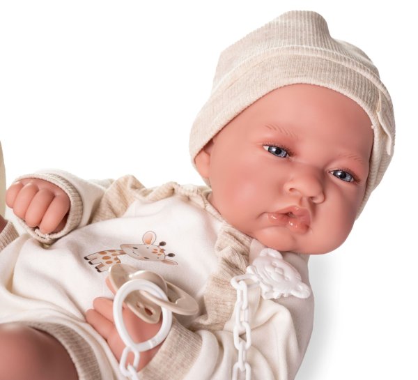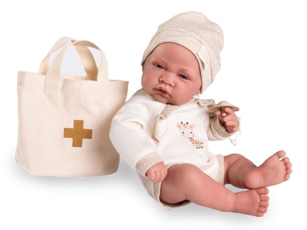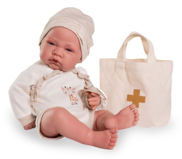 Ručně vyrobená realistická španělská panenka - miminko new born s celovinylovým tělem a realistickým vyobrazením různých miminkovských faldíků a detailů včetně pohlaví. Panenka je vyrobená ze speciálního měkčeného vinylu, velmi příjemného na dotek. Miminko lze koupat, ale je potřeba dát pozor, aby se nenamočily řasy. Odlepené řasy nejsou pak důvodem k reklamaci. Oblečení některých panenek bylo vyrobeno z organické bavlny, která zaručuje výrobu z ručně sbírané, ekologicky bez chemického ošetření pěstované bavlny. Firma Antonio Juan klade velký důraz na ekologii a proto jako první využívá v tomto odvětví zmíněnou bavlnu. Velikost 42 cm. Baleno v dárkové krabici. Doporučený věk od 3 let.