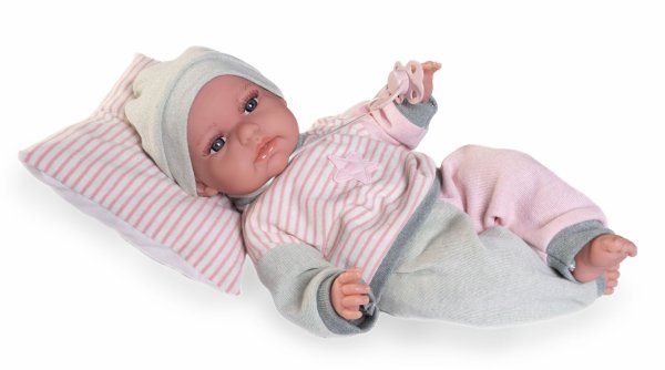 Mluvící, ručně vyrobená realistická španělská panenka - miminko. Po zatlačení na bříško začne panenka vydávat zvuky podobné dětskému žvatlání. Panenka má měkké látkové tělo, hlava a končetiny jsou vyrobené z kvalitního měkčeného vinylu. Oblečení některých panenek bylo vyrobeno z organické bavlny, která zaručuje výrobu z ručně sbírané, ekologicky bez chemického ošetření pěstované bavlny. Firma Antonio Juan klade velký důraz na ekologii a proto jako první využívá v tomto odvětví zmíněnou bavlnu. Velikost 34 cm. Baleno v dárkové krabici. Doporučený věk od 3 let. Součástí balení je 3 x knoflíková baterie LR44 s návodem na její výměnu. Baterie jsou spotřební zboží a proto jejich vybití není důvodem k reklamaci panenky.