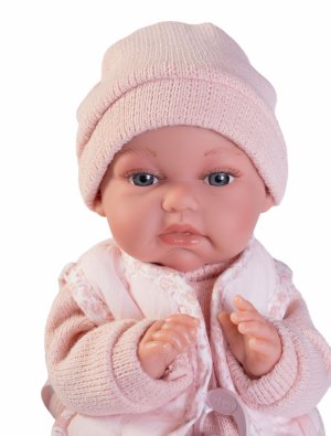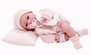 Ručně vyrobená realistická španělská panenka - miminko, se speciální pohybovou funkcí. Díky vnitřní opoře kostry těla, může dělat neobvyklé pohyby končetin, jako překřížit nožičky vleže, dát k sobě dlaně nebo zaujmat různé miminkovské polohy. Miminko má měkké látkové tělo, hlava a končetiny jsou vyrobené z kvalitního měkčeného vinylu. Oblečení některých panenek bylo vyrobeno z organické bavlny, která zaručuje výrobu z ručně sbírané, ekologicky bez chemického ošetření pěstované bavlny. Firma Antonio Juan klade velký důraz na ekologii a proto jako první využívá v tomto odvětví zmíněnou bavlnu. Velikost 34 cm. Baleno v dárkové krabici. Doporučený věk od 3 let.
