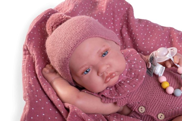 Ručně vyrobená realistická španělská panenka - miminko Reborn s některými ručně dokreslovanými detaily jako jsou: vlásky, nehtíky, žilky, obočí, načervenalá pokožka v záhybech atd. Jeho tělíčko má speciální úpravu kůže, aby byla lehce ochmýřená. Nesmí se dostat do kontaktu s vodou vzhlem k ruční malbě a použití akrylových barev. Má certifikát o původu - rodný list a váží 1090 gr. Panenka je vyrobená ze speciálního měkčeného vinylu, velmi příjemného na dotek. Oblečení některých panenek bylo vyrobeno z organické bavlny, která zaručuje výrobu z ručně sbírané, ekologicky bez chemického ošetření pěstované bavlny. Firma Antonio Juan klade velký důraz na ekologii a proto jako první využívá v tomto odvětví zmíněnou bavlnu. Velikost 42cm. Baleno v dárkové krabici. Tato panenka není klasicku hračkou pro malé děti, doporučený věk od 14 let.