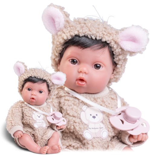 Ručně vyrobená realistická španělská panenka - miminko new born s celovinylovým tělem a realistickým vyobrazením různých miminkovských faldíků a detailů včetně pohlaví. Panenka je vyrobená ze speciálního měkčeného vinylu, velmi příjemného na dotek. Oblečení některých panenek bylo vyrobeno z organické bavlny, která zaručuje výrobu z ručně sbírané, ekologicky bez chemického ošetření pěstované bavlny. Firma Antonio Juan klade velký důraz na ekologii a proto jako první využívá v tomto odvětví zmíněnou bavlnu. Velikost 21 cm. Doporučený věk od 2 let.