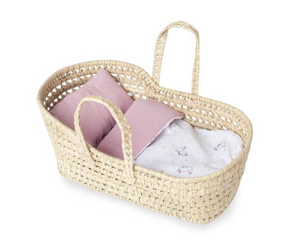 Mojžíšův košík Antonio Juan pro panenky a miminka s povlečením, udělá radost každé malé mamince, která chce mít svou panenku či miminko vždy po ruce. Ozdobná peřinka s polštářem a matrací je nejenom krásným doplňkem tohoto přenosného košíku, ale také nepostradatelnou výbavou každé holčičky, která si hraje s panenkami. Hrajte si, procházejte se, houpejte a uspávejte, prostě si užívejte svou hru naplno. Tento prostorný košík je určený pro panenky velikosti 42-50 cm, ale velmi dobře může posloužit i jako místo pro uložení plyšáků či jiných hraček a zdobit tak dětský pokojík. Košík je ručně tkaný ze sušených palmových listů, jedná se tedy o ekologický výrobek vyrobený ze 100% přírodních materiálů. Při zašpinění otřete vlhkým hadříkem a ihned osušte. Rozměry košíku: (D x Š x V) 50 x 30 x 22 cm. Vyrobeno ve Španělsku - Onil. Baleno v igelitovém obalu. Doporučený věk od 3 let.