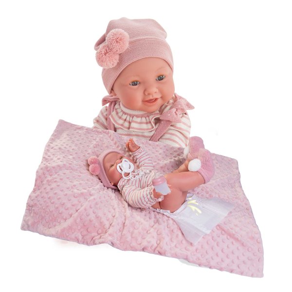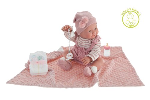 Mrkací a čůrající, ručně vyrobená realistická španělská panenka - miminko new born s celovinylovým tělem a realistickým vyobrazením různých miminkovských faldíků a detailů včetně pohlaví. Panenka je vyrobená ze speciálního měkčeného vinylu, velmi příjemného na dotek. Oblečení panenky bylo vyrobeno z organické bavlny, která zaručuje výrobu z ručně sbírané, ekologicky bez chemického ošetření pěstované bavlny. Firma Antonio Juan klade velký důraz na ekologii a proto jako první využívá v tomto odvětví zmíněnou bavlnu. Velikost 42 cm. Součástí balení je i lahvička plnitelná vodou a dvě jednorázové plínky. Baleno v dárkové krabici. Doporučený věk od 3 let.