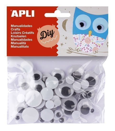 Oči s pohyblivou zorničkou - polotovar pro výtvarnou práci. Kulatý tvar očí v mixu velikostí: 10 ks/ 20 mm, 20ks/ 15 mm, 25ks/ 10 mm, 20 ks/ 8 mm. Celkem 75 ks v balení.