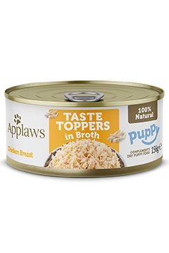 Doplňkové krmivo Taste Toppers pro štěňata od dvou měsíců věku. Konzervy Applaws pro psy obsahují pouze čisté maso v celých kouscích! Žádné náhražky a imitace masových kousků. K výrobě této konzervy se používají pouze ty nejjemnější kousky kuřecích prsou, tedy vysoce kvalitní bílkoviny pro podporu růstu a vývoje vašeho štěněte. Trhané kousky kuřete, speciálně vyrobené pro štěňata s vyvíjejícími se zuby a dásněmi. Kuřata jsou z volných výběhů a jsou krmena výhradně organickým krmivy bez použití hormonů.