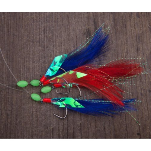 Systém pro lov makrel s třemi háčky. Nad háčkem jsou fluoro korálky a na háčku fluorescenční folie s barevnými střapci.