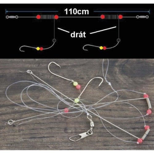 Hlavní vlasec je osazen dvěma háčky, jsou umístěny na ocelovém rameni, které dovoluje nástraze rotovat okolo vlasce bez zamotání. Součástí balení je EVA Board - pěnová deska na návazce.