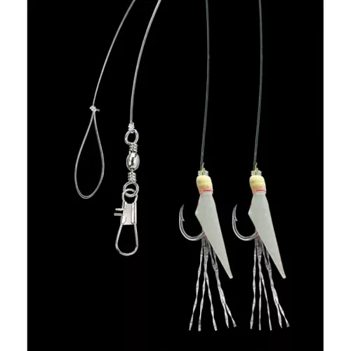 Mořský návazec se dvěma háčky velikost 8 potaženými pravou rybí kůží v barvě natural. Přirozený odstín a realistický pohyb zaručují účinné záběry i v čisté vodě. Hlavní vlasec 0,35 mm, přívěs 0,30 mm, délka 150 cm, nosnost 6 kg.