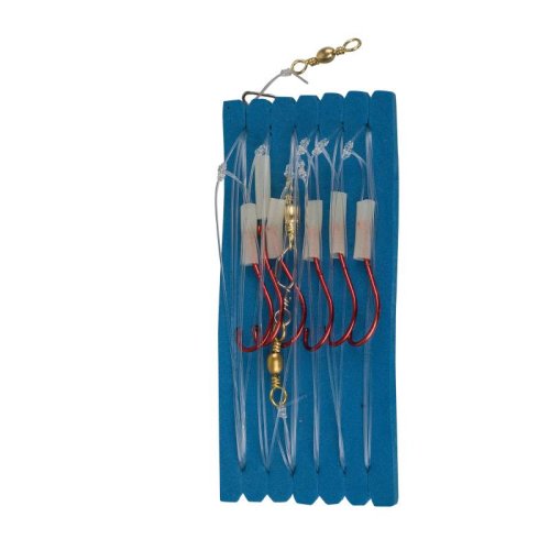 Systém s šesti červenými háčky. Na každém háčku je fluorescenční převlek. Cílová ryba je okouník.