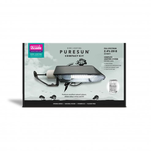 PureSun-CompactKit je standardně dodáván v balení se svítidlem, vysoce efektivním reflektorem, keramickou objímkou se závitem E27, el. přívodním kabelem se spínačem, držáku lampy pro montáž na ptačí klece, ochranné mřížky osvětlení a kompaktní žárovkou 20W Arcadia PureSun Bird Lamp Compact s obsahem 2,4% UVB, 30% UVA.