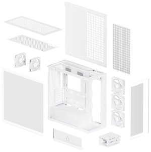 Skříň je vybavena 5 předinstalovanými ventilátory s fluid dynamic ložisky a A-RGB Gen2 podsvícením, které zajišťuje nejen efektivní chlazení, ale i působivý vizuální efekt. Čiré skleněné panely umožňují plný pohled na vnitřek sestavy.