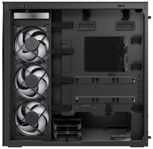 Skříň je vybavena kompletním chladicím systémem s 5 předinstalovanými ventilátory – 2× P12 Pro A-RGB vzadu a 3× P14 Pro Reverse A-RGB na boku. Podporuje radiátory až 360/420 mm v horní i boční pozici pro efektivní vodní chlazení. S objemem 64 litrů a rozměry 529 × 529 × 231 mm poskytuje dostatek prostoru pro všechny komponenty.