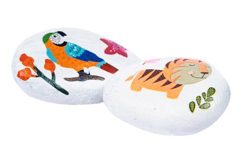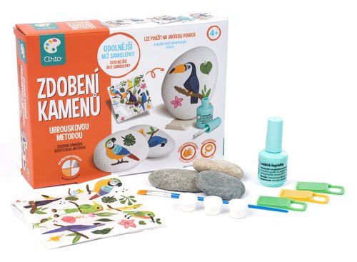 Ozdob si kámen. Sada obsahuje vše pro přípravu dekoračních doplňků - pomocí specielního lepidla si ozdob kamínek dle přiložených motivů. Součástí balení jsou i stojánky.