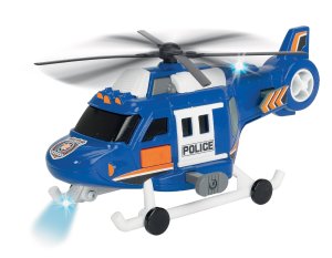 Policejní vrtulník se zvukovým a světelným efektem, na volnoběh. Manuálně ovládaný naviják, pohyblivý rotor. Délka 18 cm.
