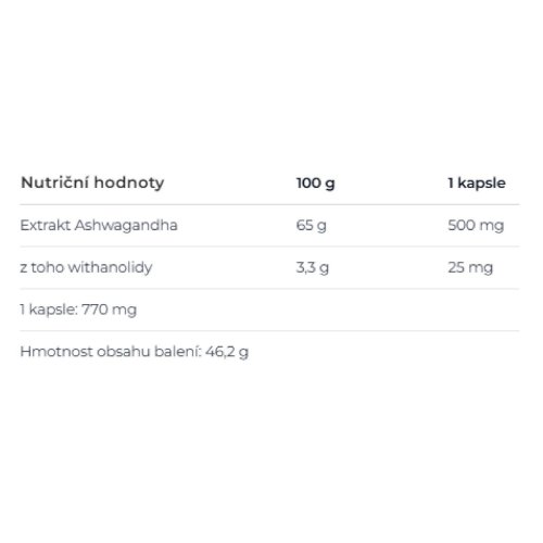 Složení: extrakt Withania somnifera – Ashwagandha (5 % withanolidů), inulin, želatinová tobolka (želatina, barvivo oxid železa).