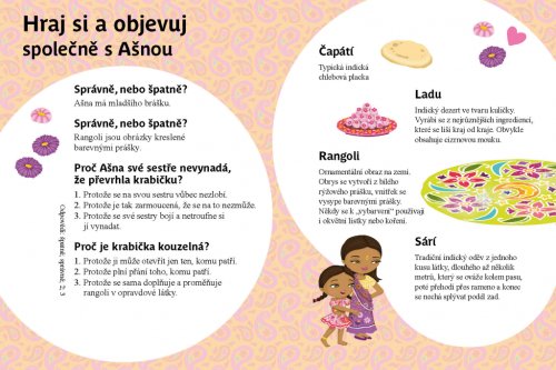 Ašna žije se svými rodiči v Indii. Každý týden pomáhá prodávat na trhu – za odměnu pak dostane peníze, které tu může utratit. Jednoho dne ji upoutá zvláštní stánek, kde se skví hromádky barevných prášků na rangoli, krásné obrazce, které se kreslí na zem před domem, aby nosily štěstí. Ašna si koupí krabičku plnou barevných prášků a začne tvořit nádherné vzory, které se mění v překrásné pestrobarevné látky. A to není všechno, co její kouzelná krabička s prášky dokáže!