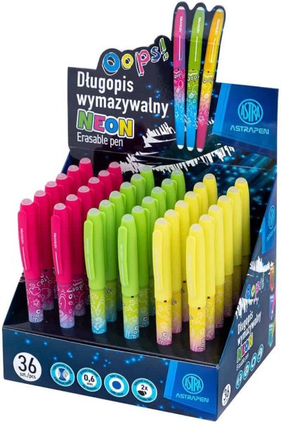 Obsahuje speciální inkoust, který se dá smazat oběma konci pera. Pero je vyrobeno ze speciálního protiskluzového plastu a má modrou vyměnitelnou náplň. Šířka stopy: 0,6mm.