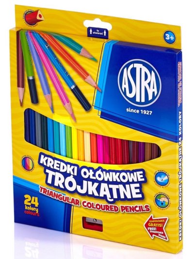 Souprava 24 kusů ergonomických pastelek Astra a ořezávátka. Pastelky mají měkkou odolnou tuhu a snadno se ořezávají. Trojhranný tvar usnadňuje dětem jejich držení.