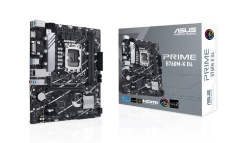ASUS Prime B760M-K D4, an Intel® B760 LGA 1700 mATX motherboard with PCIe 4.0, two PCIe 4.0 M.2 slots, DDR4, Realtek 2.5Gb Ethernet, VGA, HDMI®, SATA 6 Gbps, front USB 3.2 Gen 1, Aura Sync