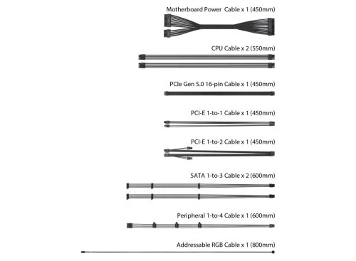 Obsah balení *Napájecí kabel x 1 *Napájecí kabel základní desky x 1 (450 mm) *Kabel procesoru x 2 (550 mm) *Kabel PCI-E Gen 5 16-pin x 1 (450 mm) *Kabel PCI-E 1-do-1 x 1 (450 mm) *Kabel PCI-E 1-do-2 x 1 (450 mm) *Kabel SATA 1-na-3 x 2 (300+200+100mm) *Periferní kabel 1-na-4 x 1 (300+100+100+100mm) *Adresovatelný kabel RGB x 1 (800 mm) *Uživatelská příručka x 1 *Držák adaptéru ATX na SFX x 1
