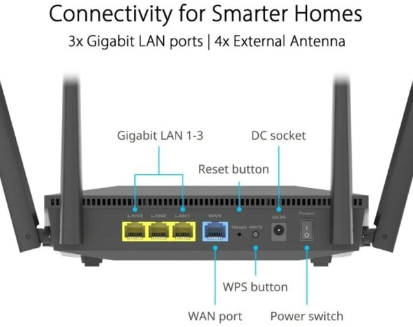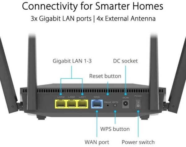 - Velmi rychlá WiFi – RT-AX52 podporuje 1024-QAM pro výrazně rychlejší bezdrátové připojení. Celková rychlost sítě je přibližně 1800 Mb/s - 574 Mb/s v pásmu 2,4 GHz a 1201 Mb/s v pásmu 5 GHz.