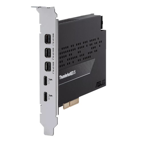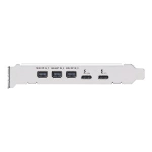 Díky dvěma USB-C portům Thunderbolt 5 získáváte možnost připojit až pět zařízení v řetězci a využít neuvěřitelnou šířku pásma až 120 Gb/s. Karta také nabízí výkonné nabíjení s celkovým výkonem až 130 W, přičemž jedno zařízení může získat až 96 W. Pro profesionály pracující s vysokým rozlišením jsou k dispozici tři Mini-DP porty podporující DisplayPort 2.1, které umožňují připojení až tří 8K displejů při 60 Hz s kompresí DSC.