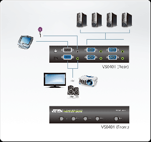 Přepínač umožní připojit 4 zdroje signálů VGA a audia a přepínat je na 1 zobrazovací jednotku(monitor). Zařízení je vhodné např. na prezentace nebo do výcvikových objektů. Zařízení má vestavěný RS-232 port pro ovládání počítačem nebo high-end zařízeními.