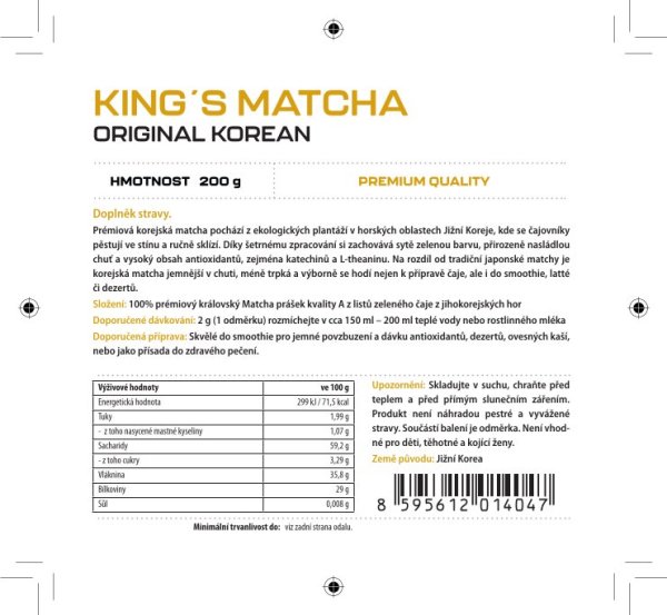 King's Grade kvalita – označení pro absolutní špičku. Nejčistší forma matchy bez kompromisů. Sametově jemná chuť – na rozdíl od japonské matchy je ta korejská přirozeně méně trpká a příjemně nasládlá. Zářivě zelená barva – vizuální důkaz čerstvosti a šetrného zpracování. Síla antioxidantů – vysoký obsah L-theaninu a katechinů podporuje soustředění, imunitu a harmonii těla i mysli. Proč právě korejská matcha? Japonská matcha je známá – ale korejská? Ta je objev, skrytý poklad mezi čaji. Díky unikátním klimatickým podmínkám a jemnější chuti si získává čím dál větší pozornost znalců i gurmánů po celém světě. A vy máte šanci ji ochutnat v její nejčistší podobě. Luxus, který si dopřejete každý den Tahle matcha není jen o zdraví. Je o stylu. O chvíli, kterou si vyhradíte jen pro sebe. Ať už si ji připravíte jako tradiční čaj, krémové latté, nebo ji přidáte do smoothie či dezertu, vždy se stává hlavní ingrediencí vašeho dne. Zasloužíte si víc než jen čaj Neprodáváme jen matchu. Nabízíme vám návrat k sobě. Zastavení. Hloubku. Kvalitu, která se nedá nahradit. Pokud hledáte výjimečnost, právě jste ji našli. Doporučené dávkování: